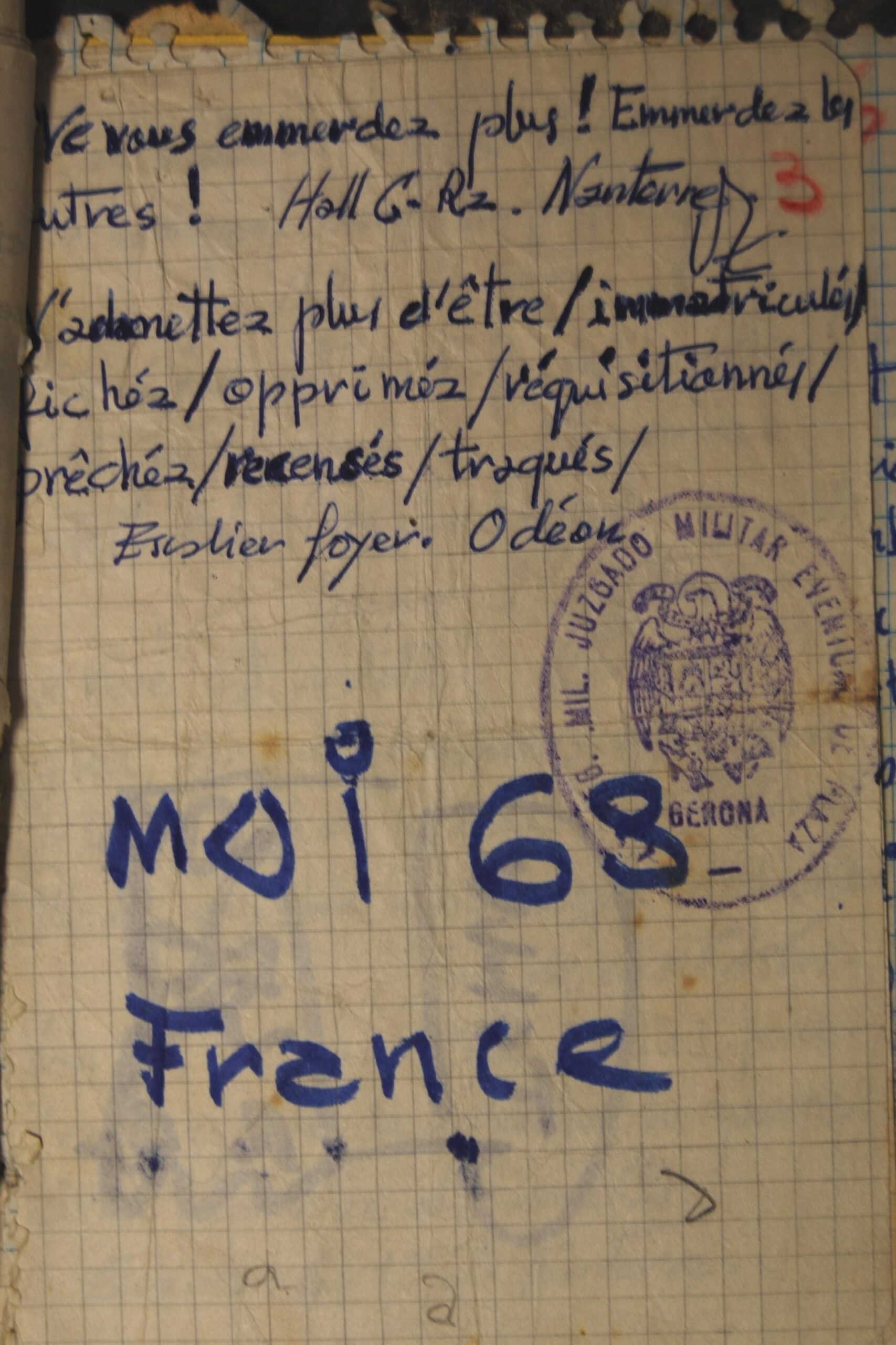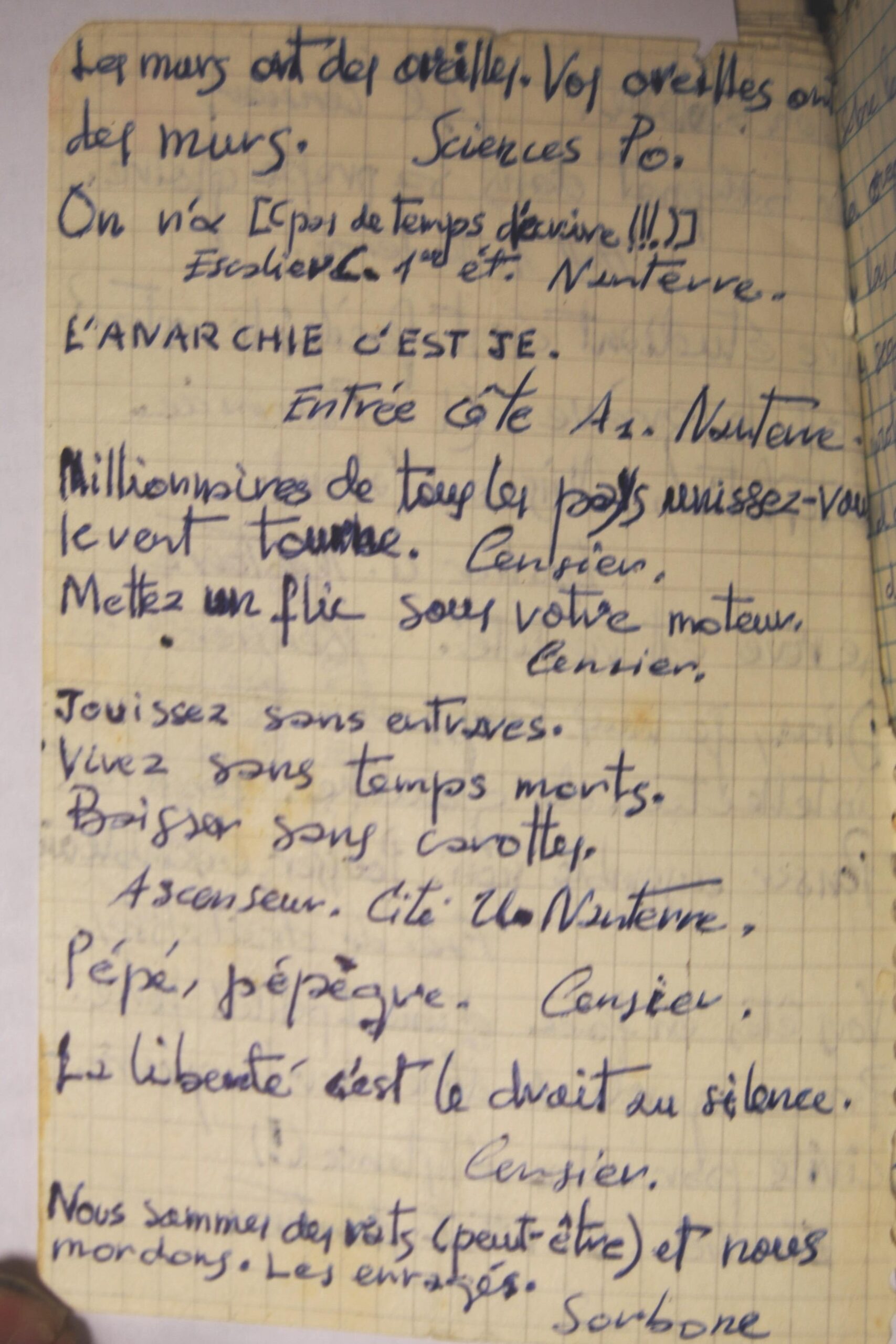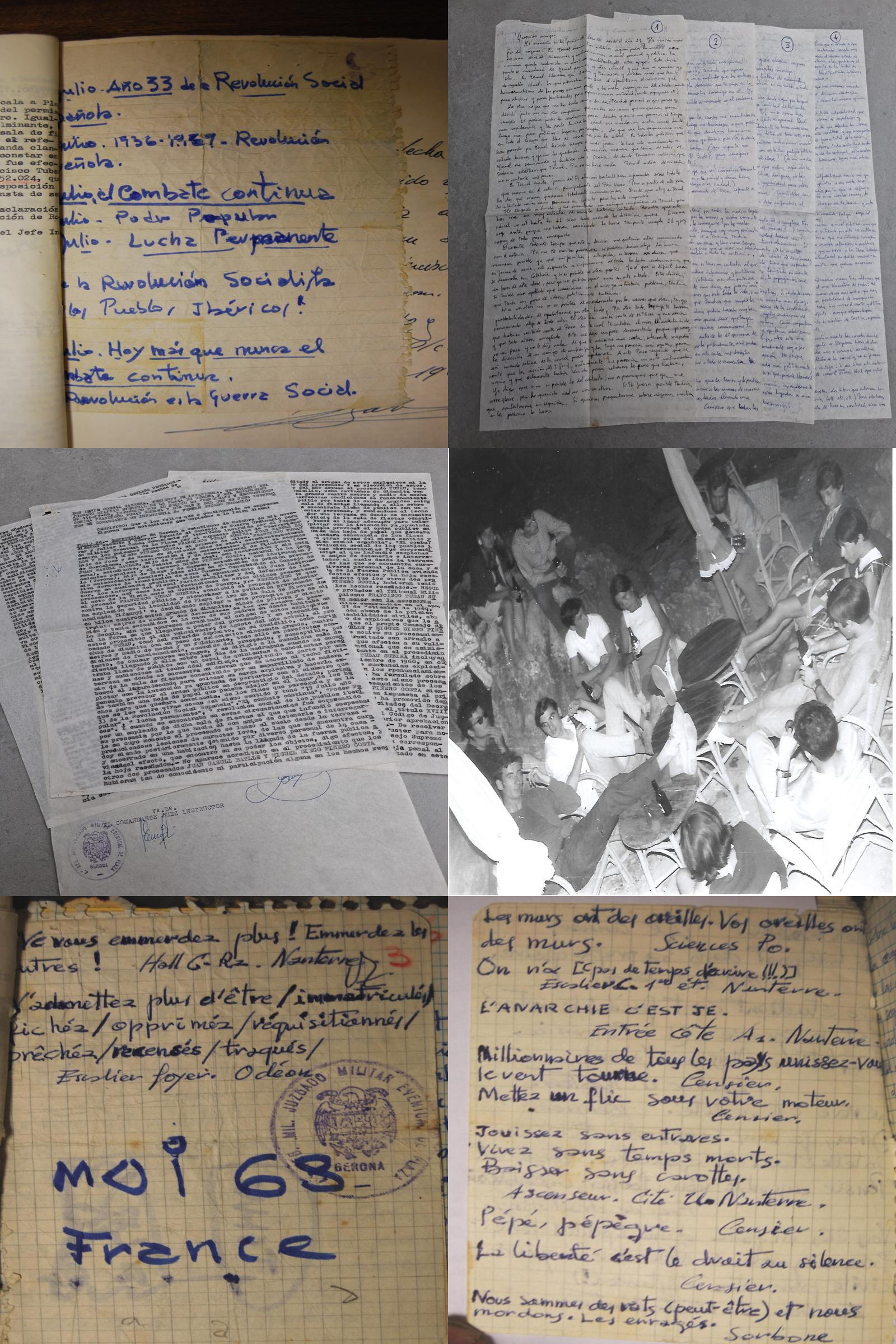 Aquestes expressions conviuen amb referències explícites a la Guerra Civil —“1936-1939. Revolución”— i amb textos en francès clarament influïts pel Maig del 68, com:
