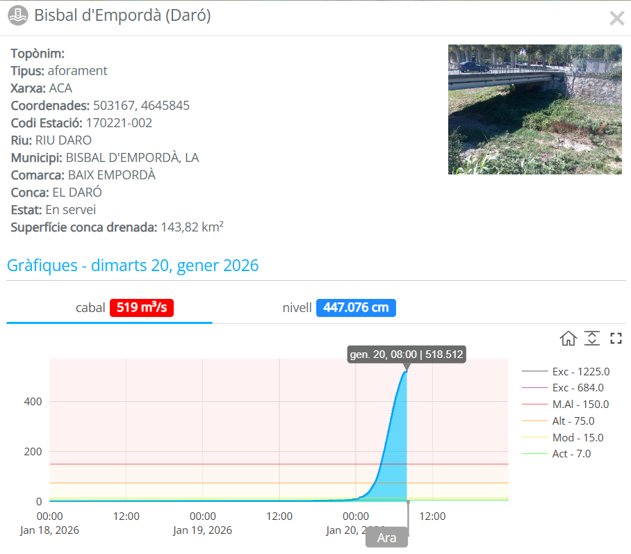 Molt delicada la situació del Daró a la Bisbal d’Empordà. El cabal del riu supera els 500 m³/s i els 400 cm. Això significa que supera, de manera àmplia, el cabal assolit durant el temporal Glòria que va tenir lloc el gener de l’any 2020.