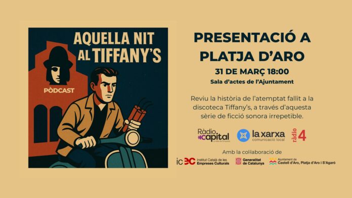 Ràdio Capital presentarà públicament el podcast de ficció sonora Aquella nit al Tiffany’s el pròxim 31 de març a les 18 h a la sala d’actes de l’Ajuntament de Platja d’Aro. L’acte servirà per donar a conèixer aquesta producció sonora inspirada en fets reals i per reflexionar sobre el procés de traslladar aquesta història al llenguatge de la ficció radiofònica.
