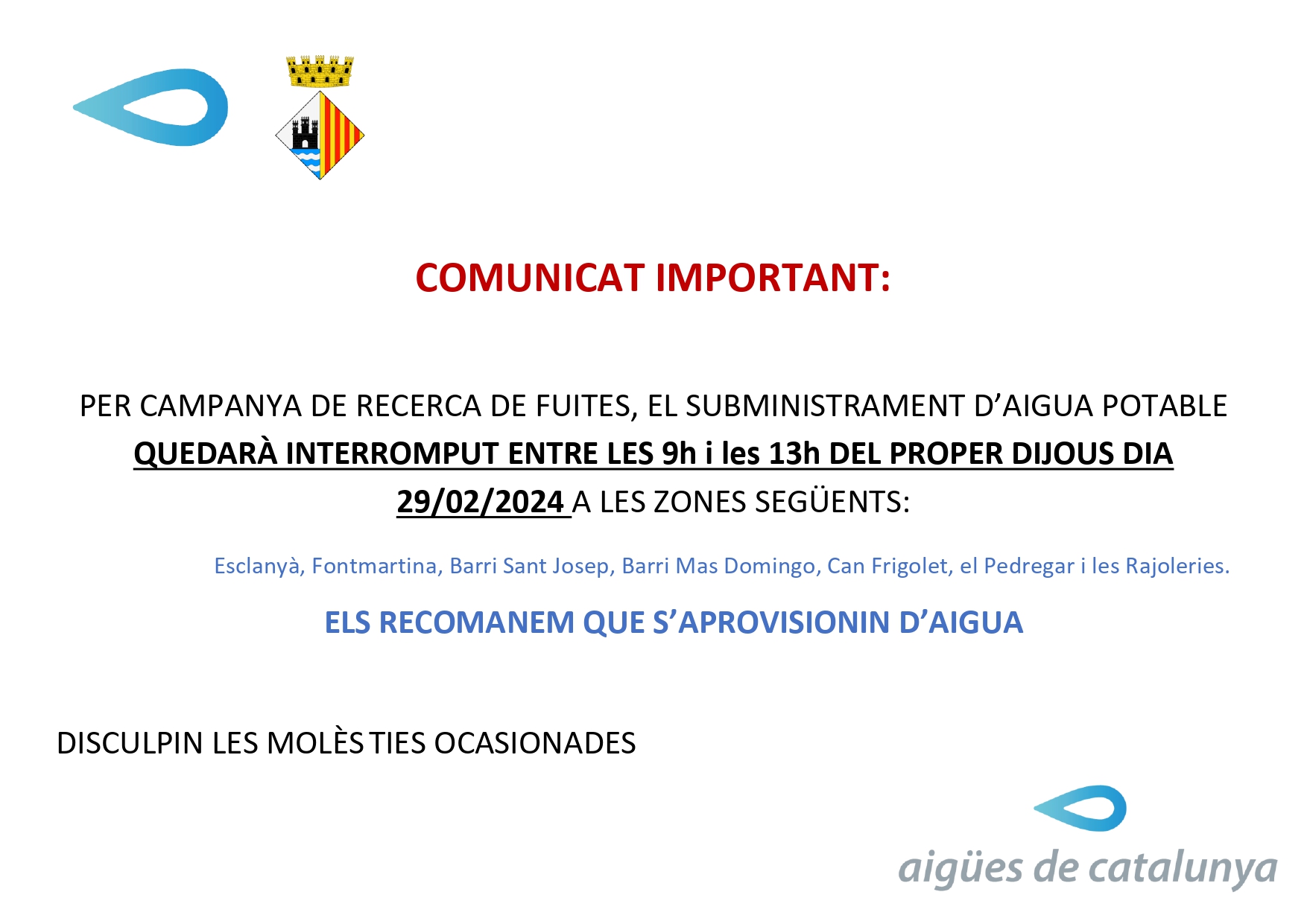 Privat: Avís important per tall de subministrament d’aigua el dijous 29 de febrer