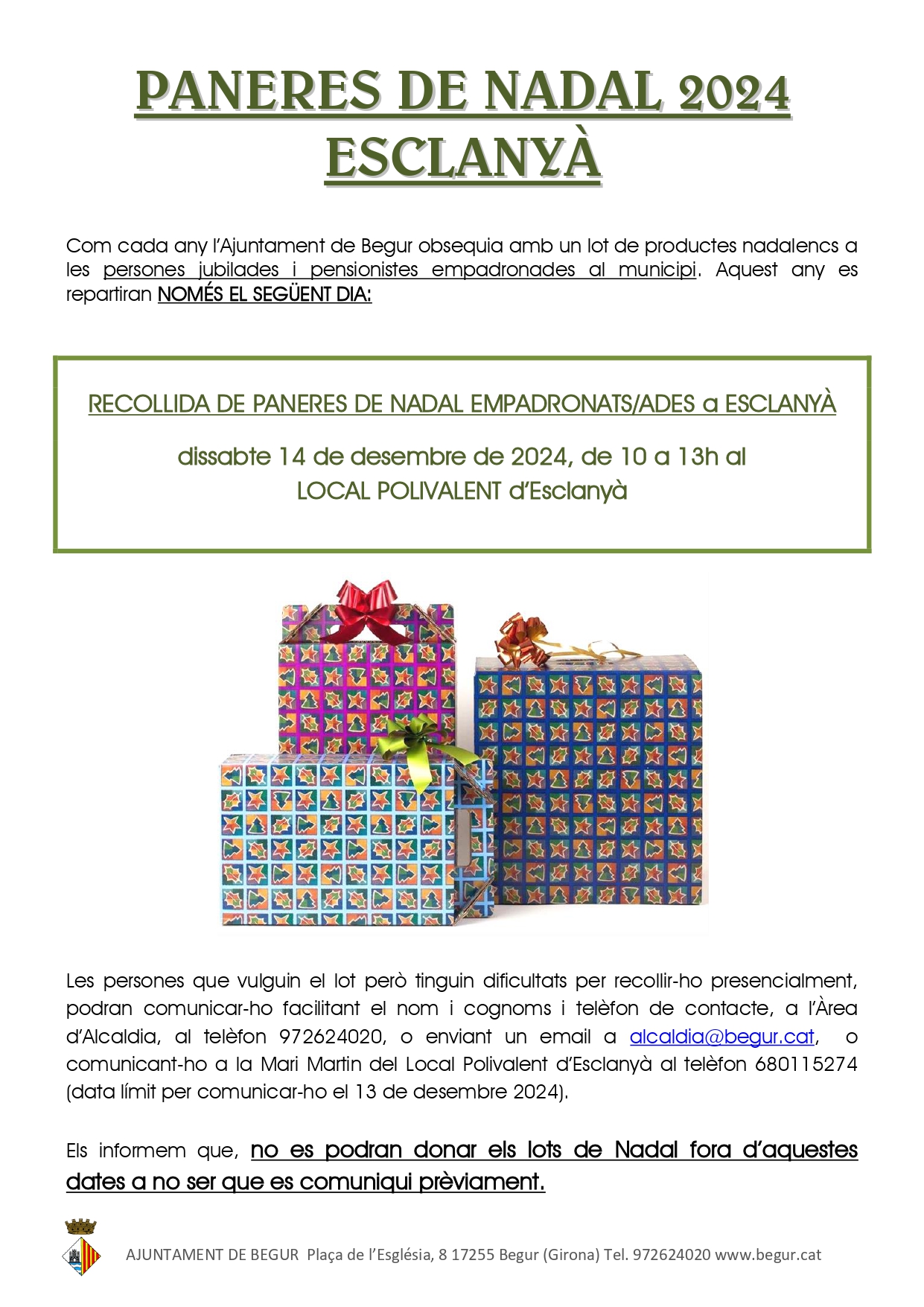 Privat: L’Ajuntament de Begur lliurarà prop d’un miler de paneres de Nadal a les persones jubilades
