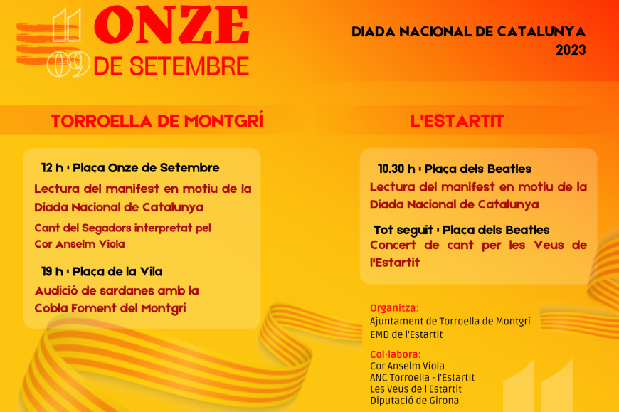 A Torroella, la lectura del manifest de la Diada es farà a les 12 h del migdia a la Plaça Onze de Setembre. També hi actuarà el Cor Anselm Viola, que interpretarà el Cant dels Segadors. I a les 19 h, en aquest cas a la Plaça de la Vila, hi haurà una audició de sardanes amb la Cobla Foment del Montgrí.