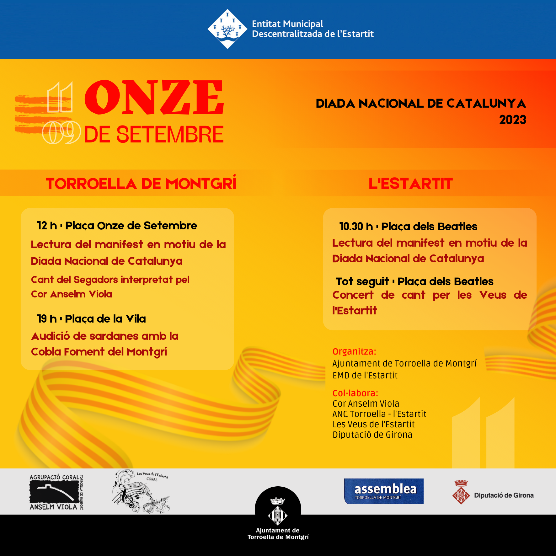 A Torroella, la lectura del manifest de la Diada es farà a les 12 h del migdia a la Plaça Onze de Setembre. També hi actuarà el Cor Anselm Viola, que interpretarà el Cant dels Segadors. I a les 19 h, en aquest cas a la Plaça de la Vila, hi haurà una audició de sardanes amb la Cobla Foment del Montgrí.
