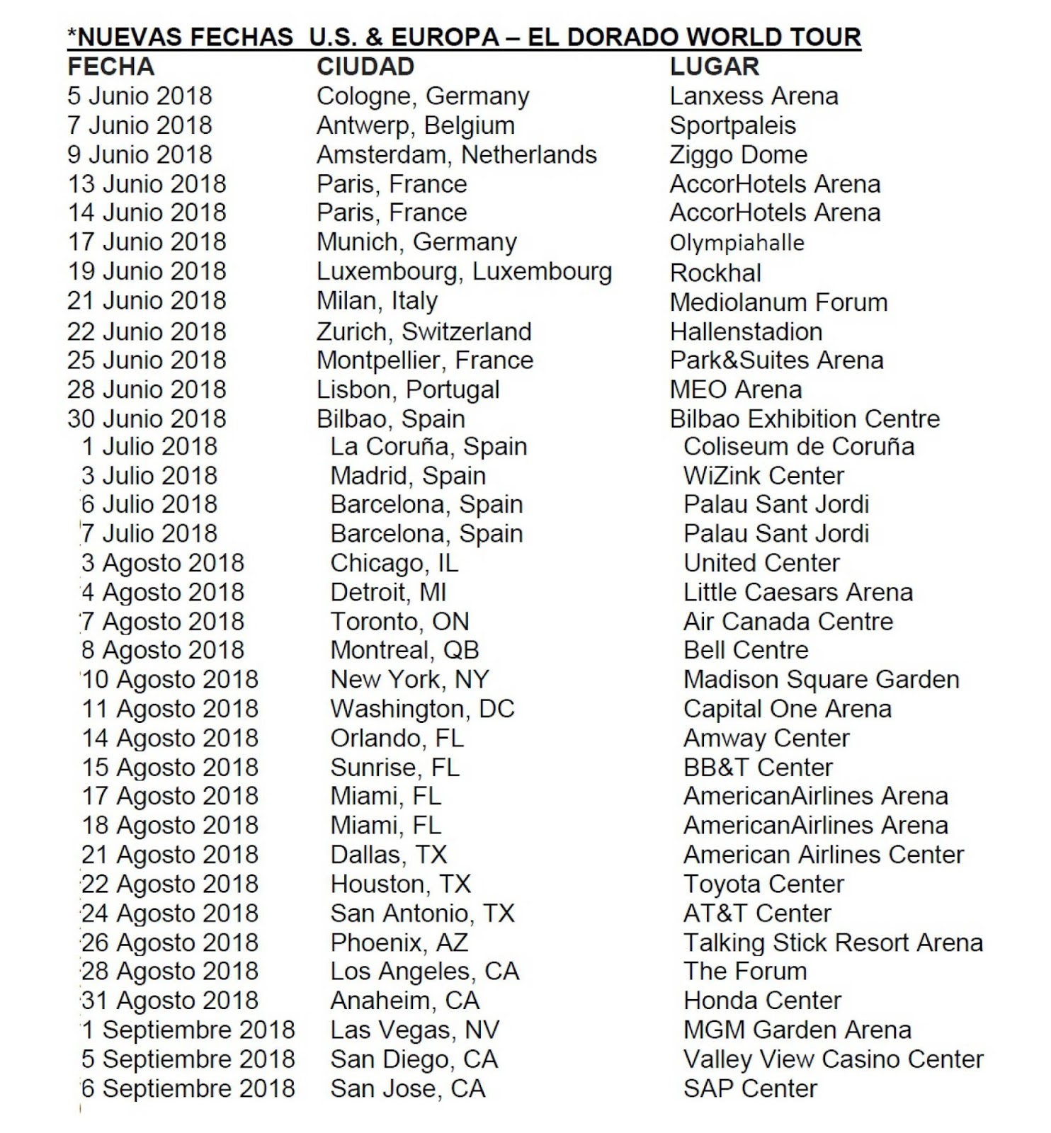 La cantant colombiana que el passat 15 de novembre va comunicar als seus fans que cancel·lava la nova gira El Dorado ha anunciat noves dates per al pròxim any. Donat que ella mateixa assegura que la lesió a les seves cordes vocals requereix temps per a sanar, ha decidit no començar la seva gira fins al 5 de juny de l’any vinent. Possiblement la notícia no hah agradat al seu grup de fans però s’han hagut d’acontentar amb el seu senyal de gratitud cap a ells pel seu suport i comprensió.