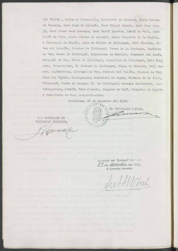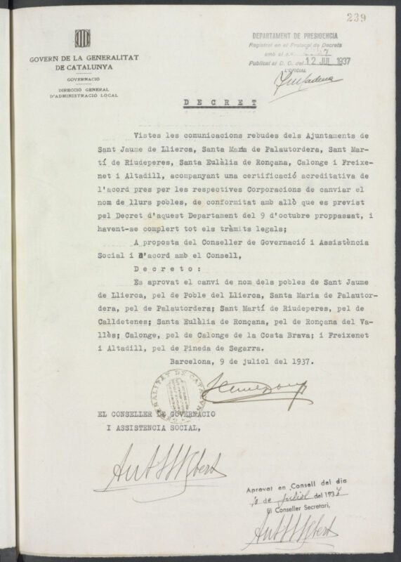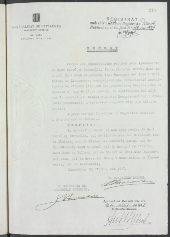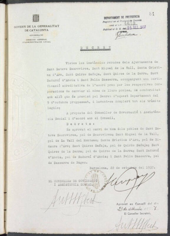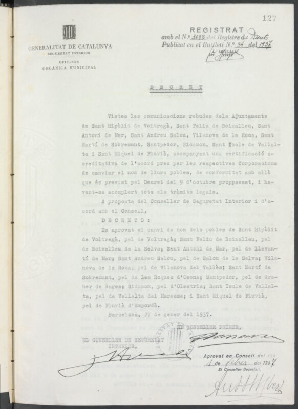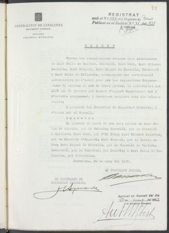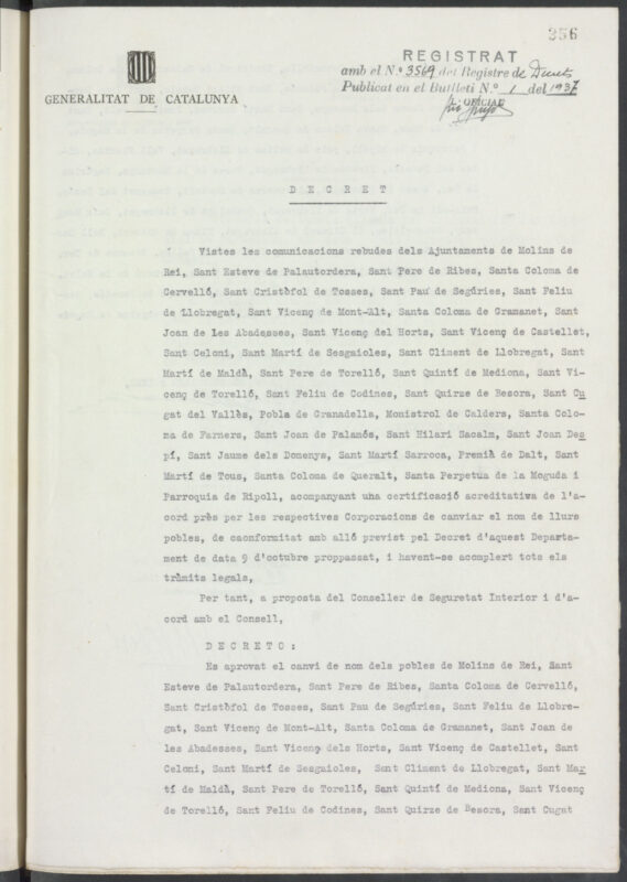 Un d’ells és el cas de la toponímia dels municipis. A principis del 1937, en plena Guerra Civil, els republicans encara mantenien el poder a les institucions locals i va ser llavors quan van decidir substituir o modificar els noms de nombroses localitats. En gran part, aquests canvis es van dur a terme amb la intenció d’eliminar la presència de referències religioses en els mateixos i es van simplificar o, sovint, es van incorporar altres elements lligats amb la realitat històrica o geogràfica de cada indret.